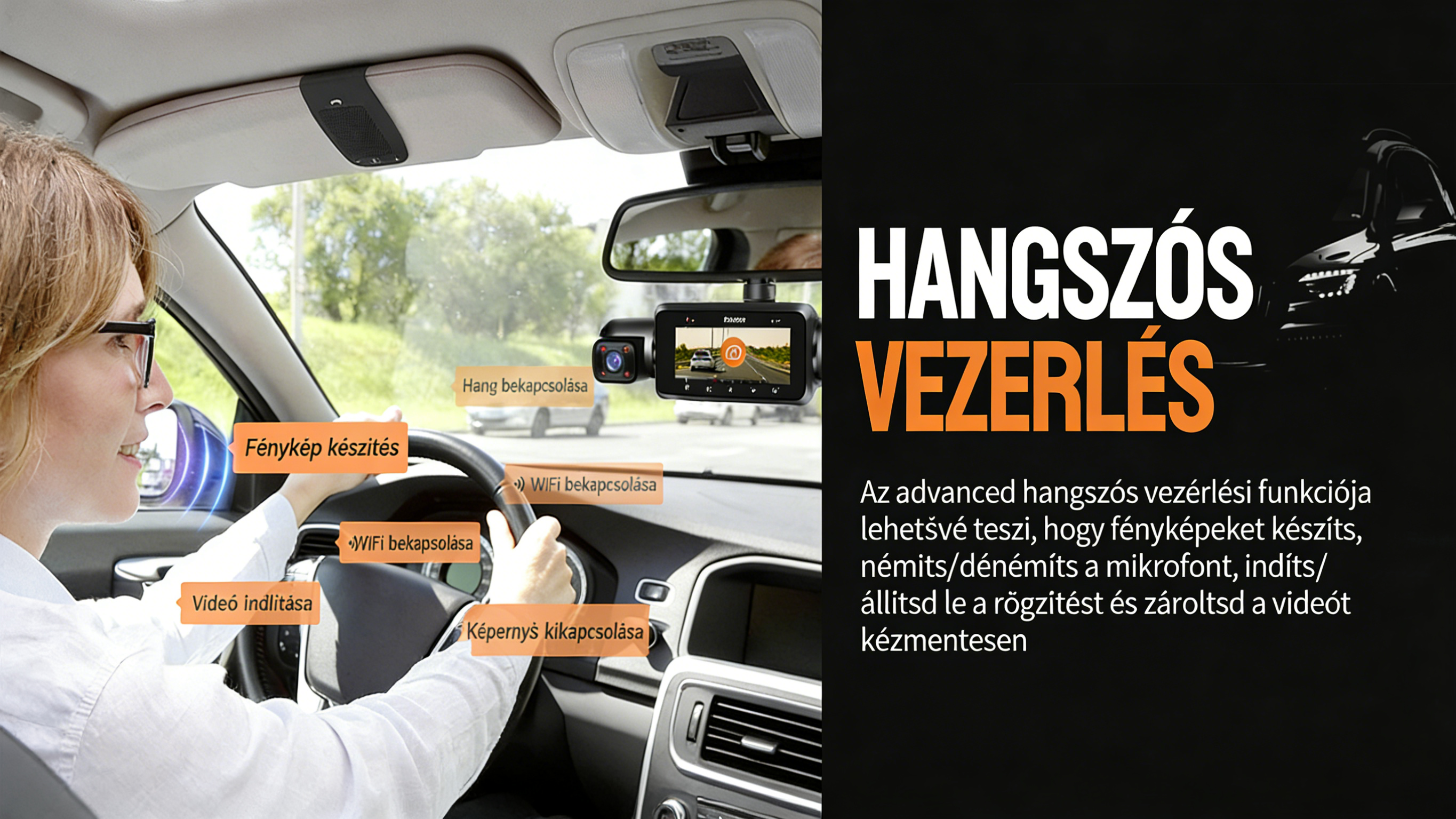 Éjjellátás · Parkolófelügyelet · GPS útvonal · WiFi kapcsolat · Hangvezérlés